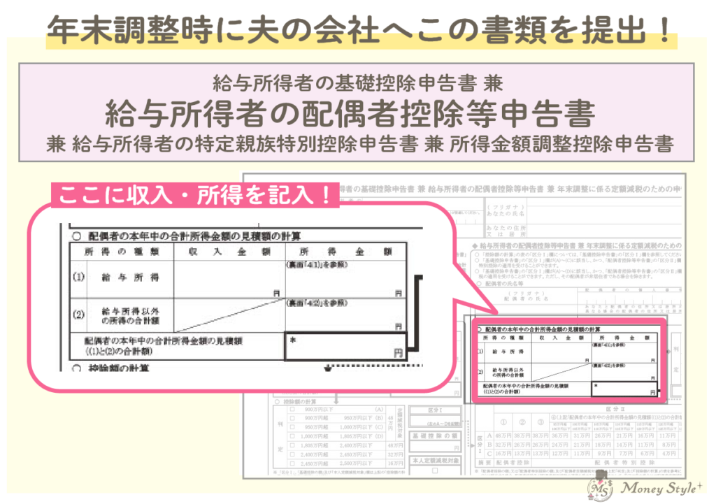 - 年末調整の書類へ妻の収入・所得を記入して、夫の会社へ提出します。